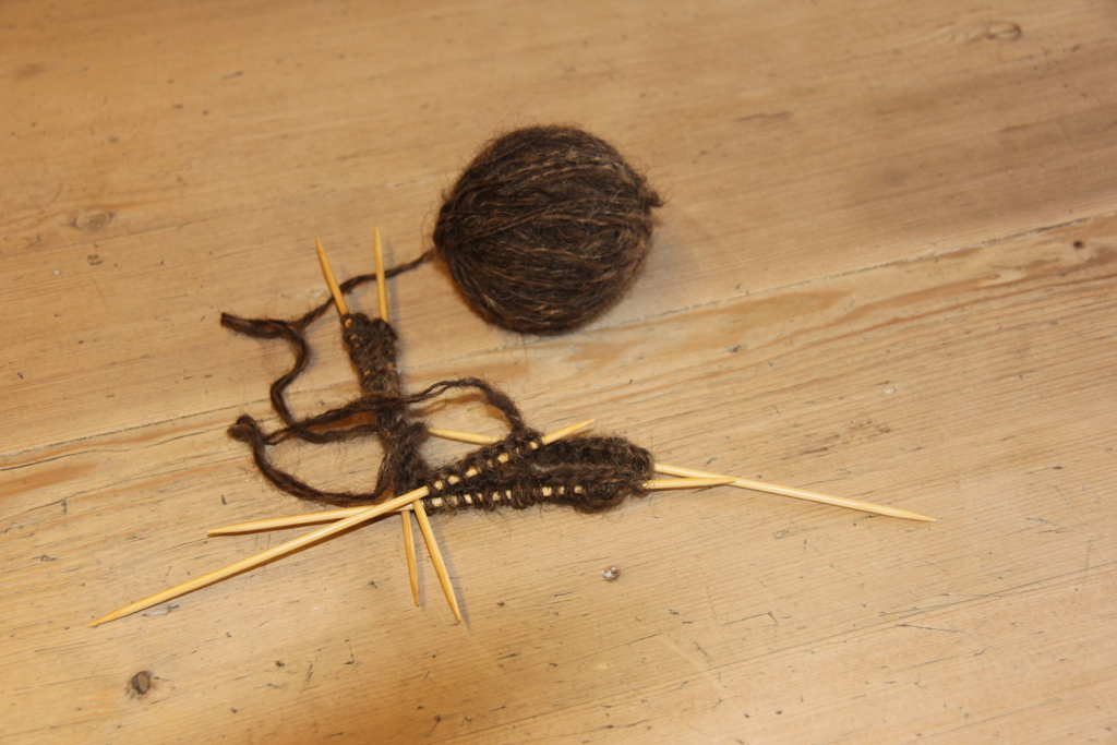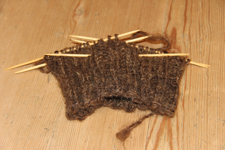 Nicht nur die selbstgesponnene Wolle ist rustikal, auch das Stricken. Es geht nicht so einfach von der Hand wie mit “normaler” Wolle, aber es lohnt sich natürlich. Welche andere Wolle ist zugleich Handcreme? Hier was ich so an einem Abend während eines Podcasts stricke: