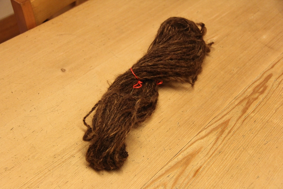 Die gewaschene Wolle lasse ich auf einem Handtuch auf der Ofenbank trocknen. Dann wickle ich sie zu einem Knäuel auf: