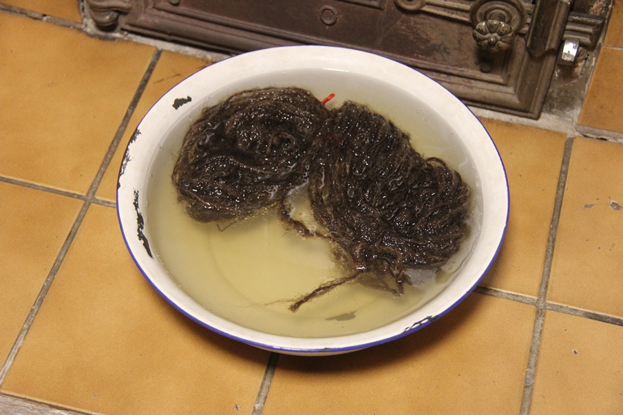 Nun kann die Strange in kaltes Wasser einlegen zum Waschen. Später nehme ich etwas wärmeres Wasser und wiederhole das, bis das Wasser klar wird.